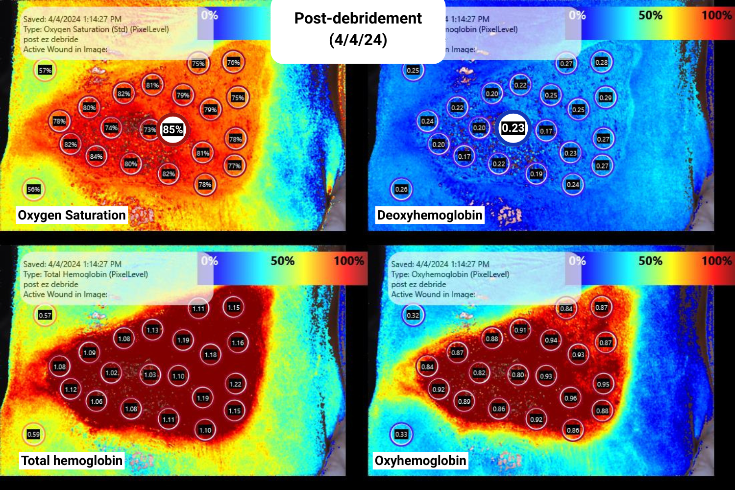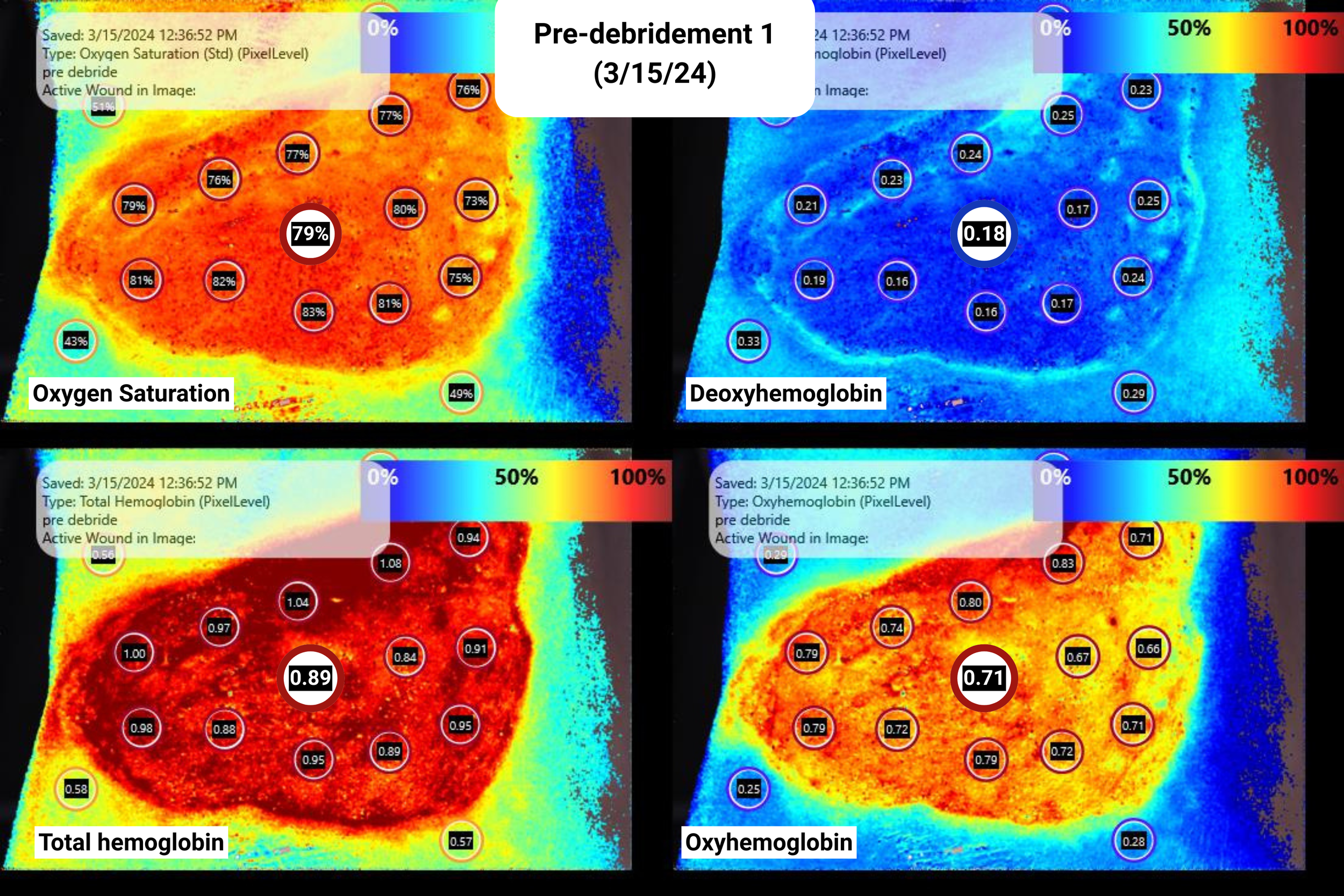 Deoxyhemoglobin along the upper right margin of the wound was elevated, indicating the patient may have benefitted from further debridement along that margin to remove any devitalized tissue