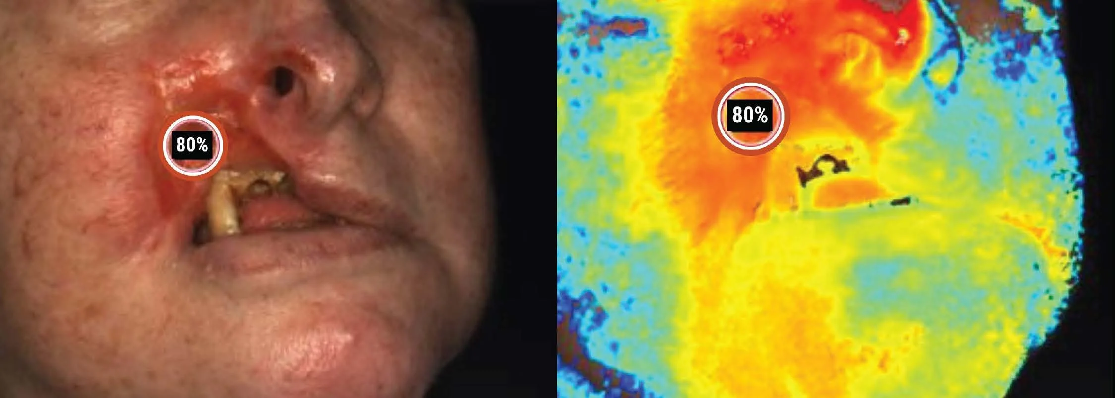 In March 2025, SnapshotNIR was used to capture a baseline tissue oxygen saturation, which demonstrated hypoxia near the necrotic area and lower aspect of the patient’s face. The patient had no viable tissue on the right side of the nose and upper lip with poor definition, and missing teeth.
