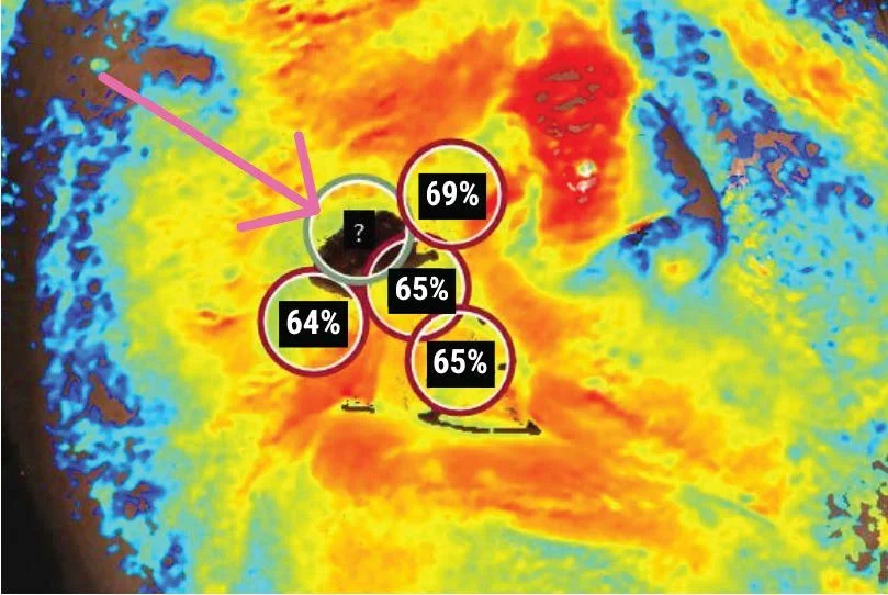 Image 2. April 16, 2025. StO2 image from SnapshotNIR after seven HBO sessions which showed increased StO2 (65%, 68%, and 71%), and a significant reduction of necrotic tissue in the region of interest (pink arrow).