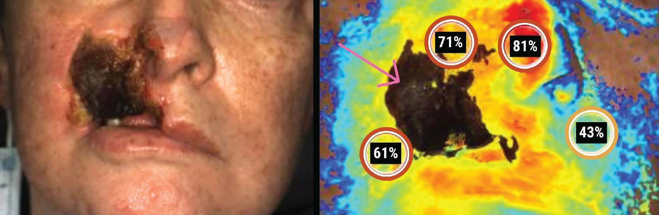 Image 1. Baseline, March 27, 2025, clinical image (left) and StO2 image (right) from SnapshotNIR. Markers read 61%, 71%, 81%, and 43% in the surrounding tissue. There is extensive necrotic tissue present in the region of interest (pink arrow).